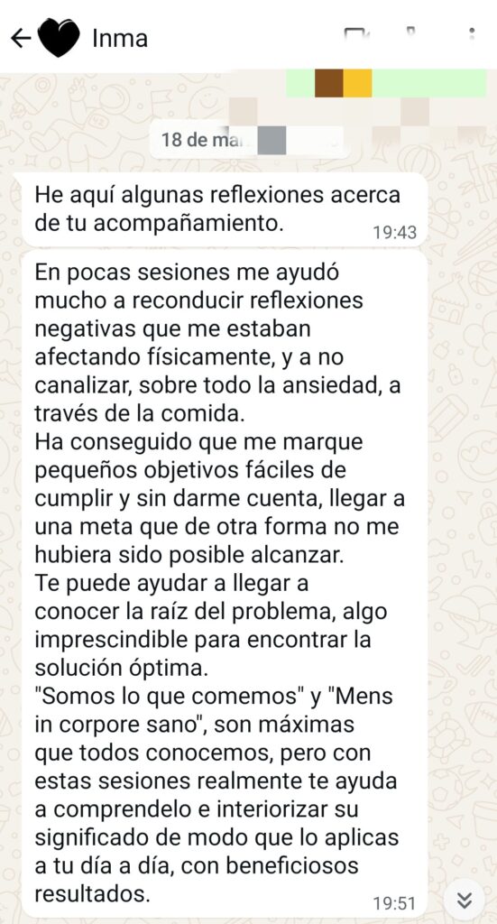 Estoy convencida de que desde la primera sesión vas a empezar a sentirte mejor contigo misma, vas a sentir que ese es el camino, aprender a cuidarte sin restricciones y efectos rebote, sintiendo que tus necesidades son escuchadas y sostenidas.